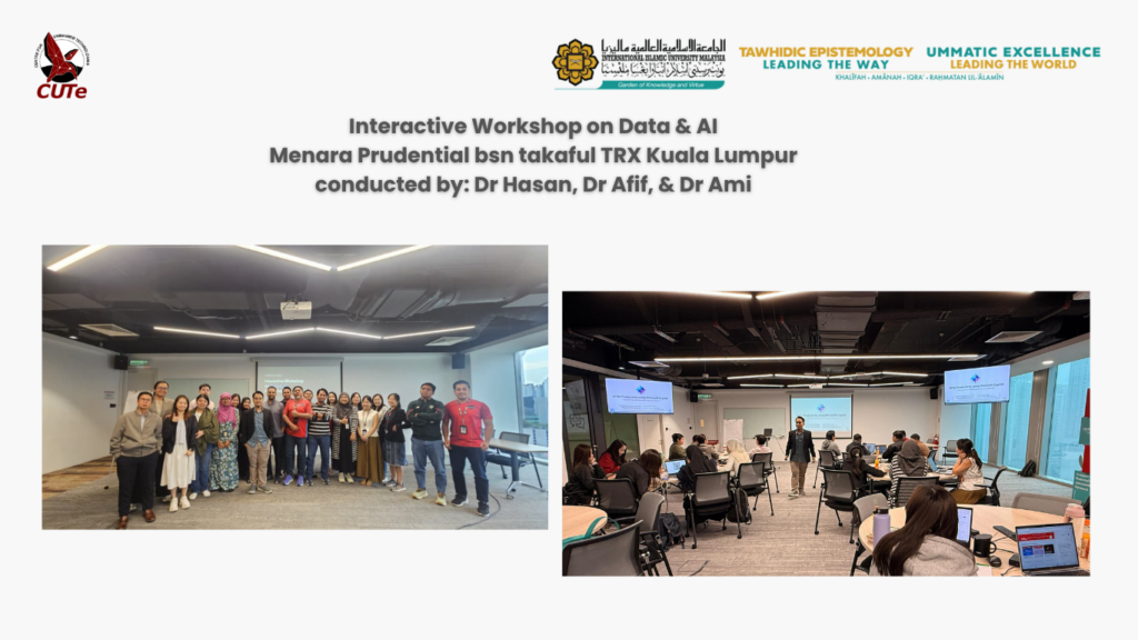 The Interactive Workshop on Data & AI was successfully conducted on 21 April at Menara Prudential BSN Takaful, TRX, Kuala Lumpur. The workshop was facilitated by Dr Hasan, Dr Afif, and Dr Aimi, with participation from 22 professionals across different industries in an interactive learning environment.